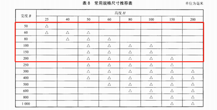 金屬線槽的規格定義一般是小于200mm以下的,下面提供了一份來自于JB∕T 10216-2013 《電控配電用電纜橋架》表8所示的市面上常用的金屬線槽規格參考:
