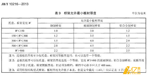 根據(jù)《鋼制電纜橋架工程技術(shù)規(guī)程》編號(hào):T/CECS31-2017-3.5.5章規(guī)定,熱浸鋅橋架厚度標(biāo)準(zhǔn)參考如下: